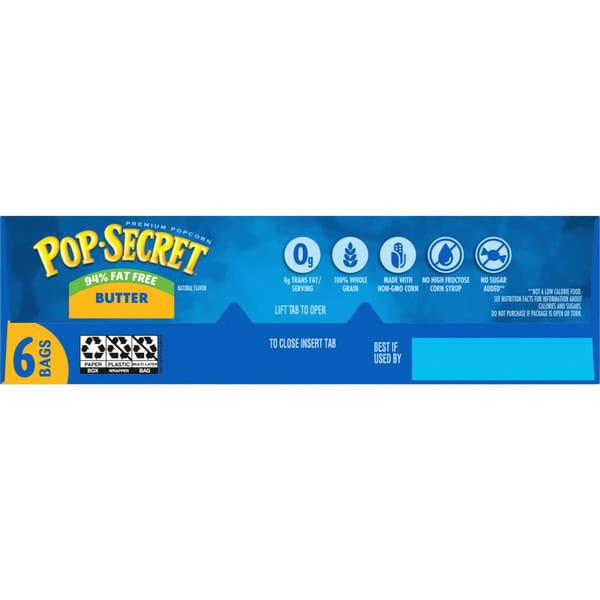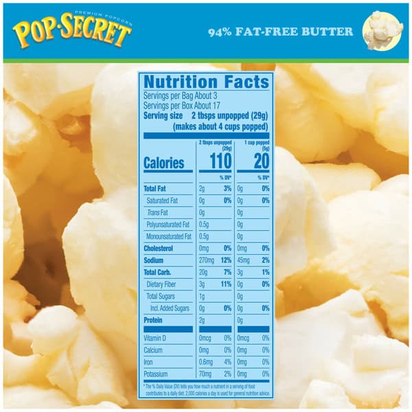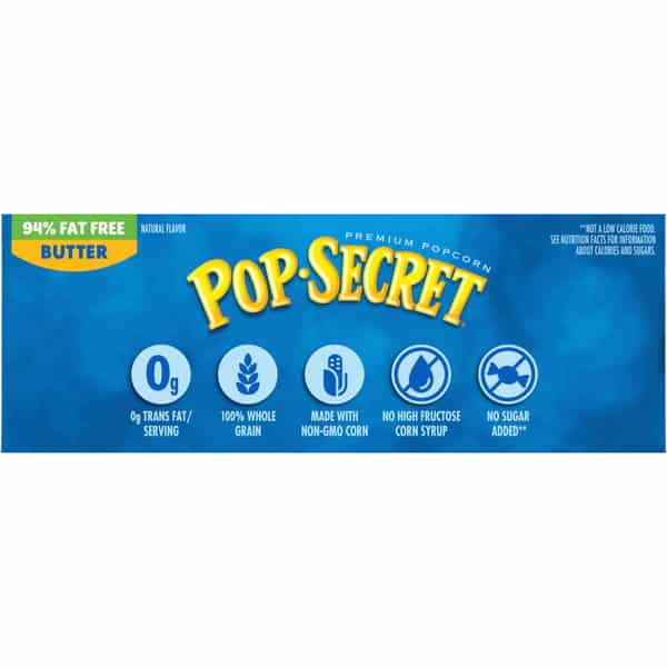 Popcorn fanatics love the delicious buttery taste of Pop Secret Secret 94% Fat-Free* Butter Flavor popcorn. What’s our secret for the best popcorn? Kernels popped up light and fluffy with delicious buttery flavor and an aroma that brings the gang together. Ready in minutes, our microwaveable popcorn bags make it easy to pop up a delicious hot popcorn treat at just 20 calories per popped cup and 33% fewer calories than our regular butter-flavored popcorn per one cup popped.** And with more than 3 servings in each of our popcorn bags, Pop Secret butter-flavored microwave popcorn is perfect for sharing. So, pop up some delicious buttery-flavor fun for movie nights, game night, or any time you’re together with family or friends! Made with non-GMO kernels, and no artificial preservatives or flavors, everyone can feel good about popping a handful of snack-time fun! Since 1985, Pop Secret has been serving up fresh, craveable popcorn snacks that bring everyone together. It’s the secret that’s too good to keep to yourself. *SEE NUTRITION FACTS FOR INFORMATION ABOUT SODIUM **94% FAT FREE BUTTER – 20 CALORIES PER 1 CUP POPPED VS OUR REGULAR BUTTER – 30 CALORIES PER 1 CUP POPPED,
