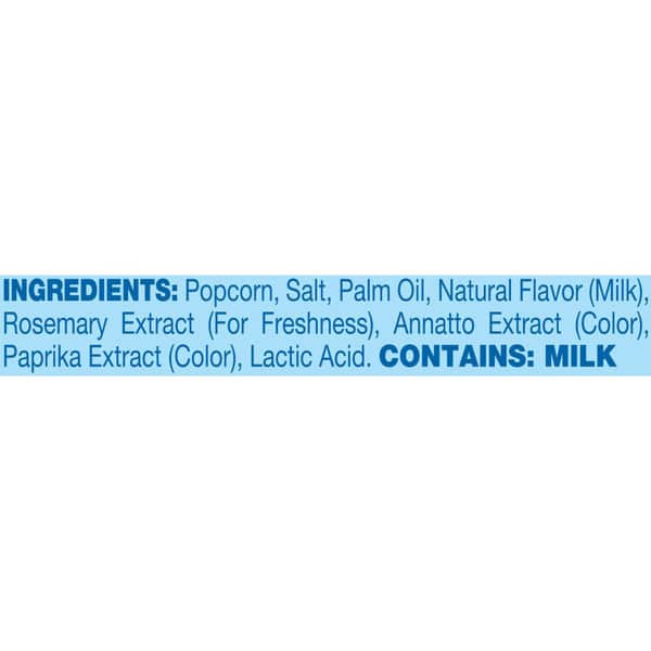 Popcorn, Salt, Palm Oil, Natural Flavor (milk), Rosemary Extract (for Freshness), Annatto Extract (color), Paprika Extract (color), Lactic Acid