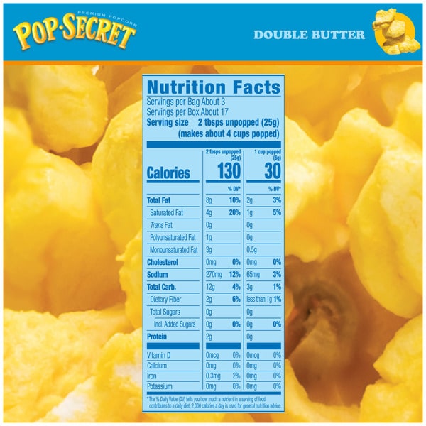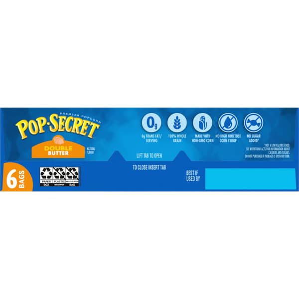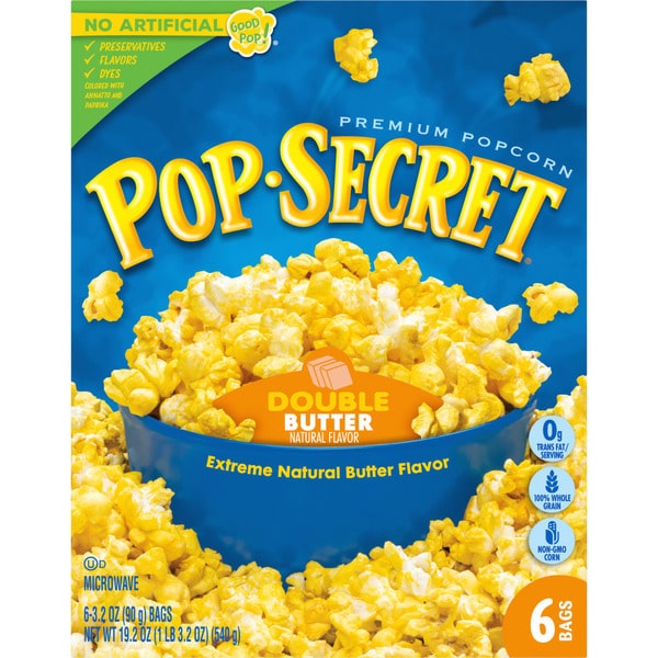 Pop Secret Double Butter Flavor popcorn is the next level in buttery flavor, and our most buttery-tasting popcorn yet. What’s our secret for the best popcorn? Kernels popped up light and fluffy with delicious buttery flavor and an aroma that brings the gang together. Ready in minutes, our microwaveable popcorn bags make it easy to pop up a delicious hot popcorn treat. And with more than 3 servings in each of our popcorn bags, Pop Secret Microwave Double Butter flavored popcorn is perfect for sharing. So, pop up some delicious buttery-flavored fun for movie nights, game night, or any time you’re together with family or friends! Made with non-GMO kernels, and no artificial preservatives or flavors, everyone can feel good about popping a handful of snack-time fun! Since 1985, Pop Secret has been serving up warm, craveable popcorn snacks that bring everyone together. It’s the secret that’s too good to keep to yourself!,
