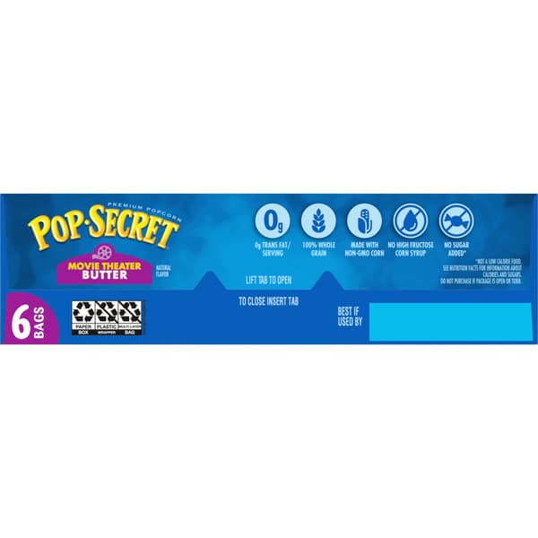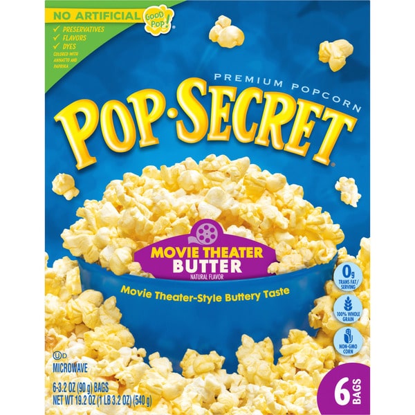 Pop Secret Movie Theater Butter Flavor is your secret to movie night! With a classically rich buttery flavor and airy crunch, this craveable popcorn makes home movie night feel like you’re at the theater, with that familiar aroma and rich flavor. Our microwaveable popcorn is ready in minutes, so it’s easy to serve up hot popcorn to family and friends. And with more than 3 servings, these popcorn bags are perfect for sharing, or pouring straight into a bowl. Made with non-GMO kernels, and no artificial preservatives or flavors, everyone can feel good about popping a handful of snack-time fun! Keep this handy 6-count box of Pop Secret Movie Theater Butter Flavor microwave popcorn bags in your pantry for whenever you need an easy snack for movie night, game time, or any time at all! Since 1985, Pop Secret has been serving up warm, buttery-tasting, craveable popcorn snacks that bring everyone together. It’s the secret that’s too good to keep to yourself!,