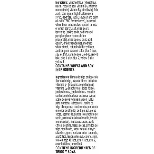 Enriched Flour (wheat Flour, Niacin, Reduced Iron, Vitamin B1 [thiamin Mononitrate], Vitamin B2 [riboflavin], Folic Acid), Corn Syrup, High Fructose Corn Syrup, Dextrose, Sugar, Soybean And Palm Oil (with Tbhq For Freshness), Bleached Wheat Flour, Contains Two Percent Or Less Of Wheat Starch, Salt, Dried Pears, Leavening (baking Soda, Sodium Acid Pyrophosphate, Monocalcium Phosphate), Dried Apples, Citric Acid, Gelatin, Dried Strawberries, Modified Wheat Starch, Natural Wild Berry Flavor, Xanthan Gum, Caramel Color, Blue 2 Lake, Soy Lecithin, Carmine Color, Red 40, Red 40 Lake, Blue 1 Lake, Blue 2, Yellow 5 Lake, Yellow 6.