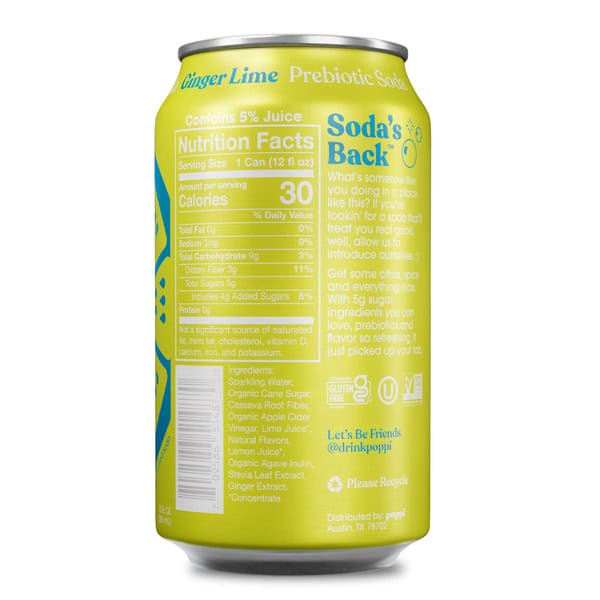 Sparkling Water, Organic Cane Sugar, Organic Apple Cider Vinegar, Lime Juice*, Organic Agave Inulin, Natural Flavors, Lemon Juice*, Stevia, *concentrate
