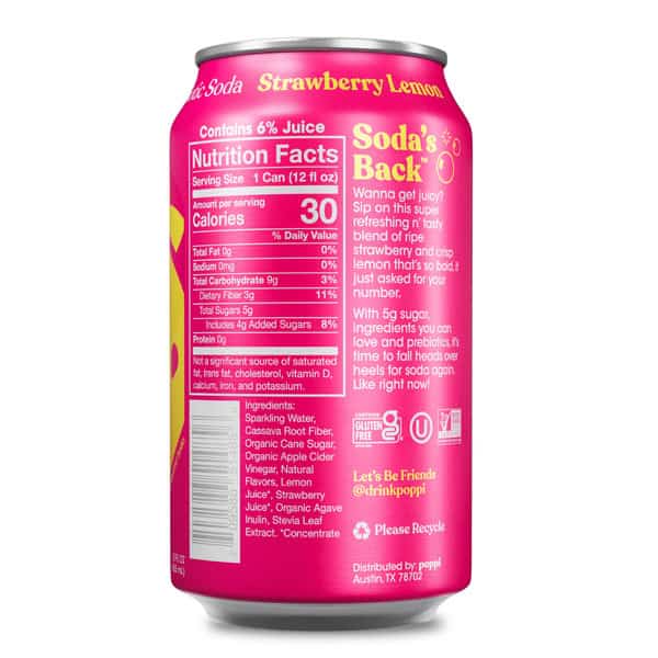 Sparkling Water, Organic Cane Sugar, Organic Apple Cider Vinegar, Organic Agave Inulin, Natural Flavors, Lemon Juice*, Strawberry Juice*, Stevia, *concentrate