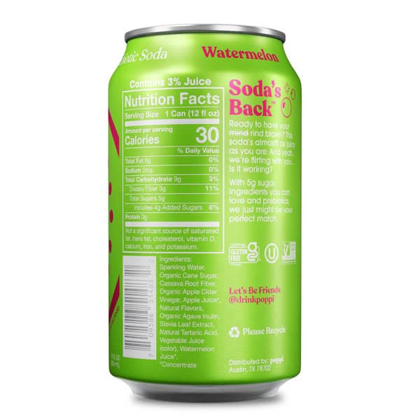 IngredientsSparkling Water, Organic Cane Sugar, Apple Juice*, Organic Agave Inulin, Organic Apple Cider Vinegar, Natural Flavors, Stevia, Tartaric Acid, Vegetable Juice Color, Watermelon Juice*, Beta Carotene Color, *concentrate