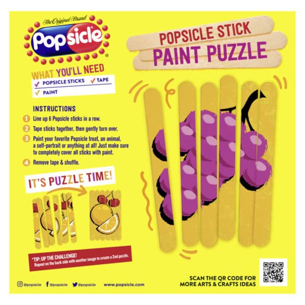 Popsicle Stick Paint Puzzle: What You’ll Need: Popsicle Sticks; Tape; Paint. Instructions: 1. Line Up 6 Popsicle Sticks In A Row. 2. Tape Sticks Together, Then Gently Turn Over. 3. Paint Your Favorite Popsicle Treat, An Animal, A Self-portrait Or Anything At All! Just Make Sure To Completely Cover All Sticks With Paint. 4. Remove Tape & Shuffle. It’s Puzzle Time! Tip: Up The Challenge! Repeat On The Back Side With Another Image To Create A 2nd Puzzle.