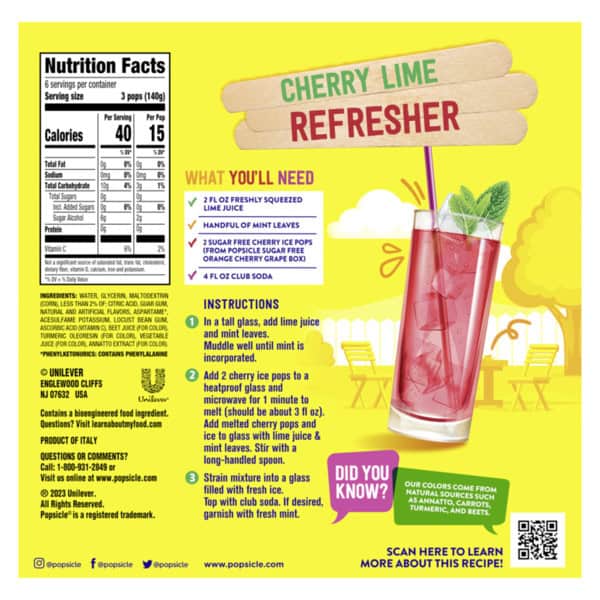 • Popsicle Sugar Free Ice Pops are an easy dessert for any occasion. Each variety box is packed with three classic flavors: orange, cherry, and grape
