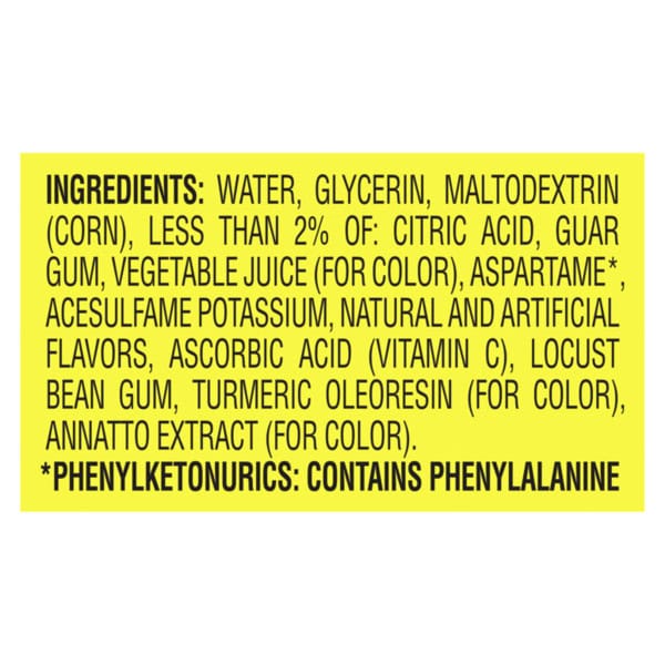 Water, Glycerin, Maltodextrin (corn), Less Than 2% Of: Citric Acid, Guar Gum, Aspartame*, Acesulfame Potassium, Locust Bean Gum, Ascorbic Acid (vitamin C), Natural And Artificial Flavors, Vegetable Juice, Annatto Extract And Turmeric Oleoresin (for Color), *phenylketonurics: Contains Phenylalanine
