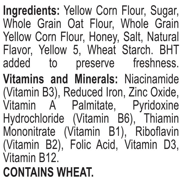 Corn Flour, Sugar, Whole Grain Oat Flour, Whole Grain Corn Flour, Honey, Salt, Natural Flavor, Yellow 5, Wheat Starch. Bht Added To Preserve Freshness. Vitamins And Minerals: Niacin- Amide (vitamin B3), Reduced Iron, Zinc Oxide, Vitamin A Palmitate, Pyridoxine Hydrochloride (vitamin B6), Thiamin Mononitrate (vitamin B1), Riboflavin (vitamin B2), Folic Acid, Vitamin D3, Vitamin B12.