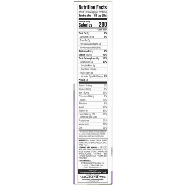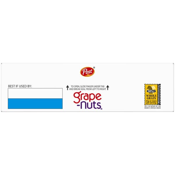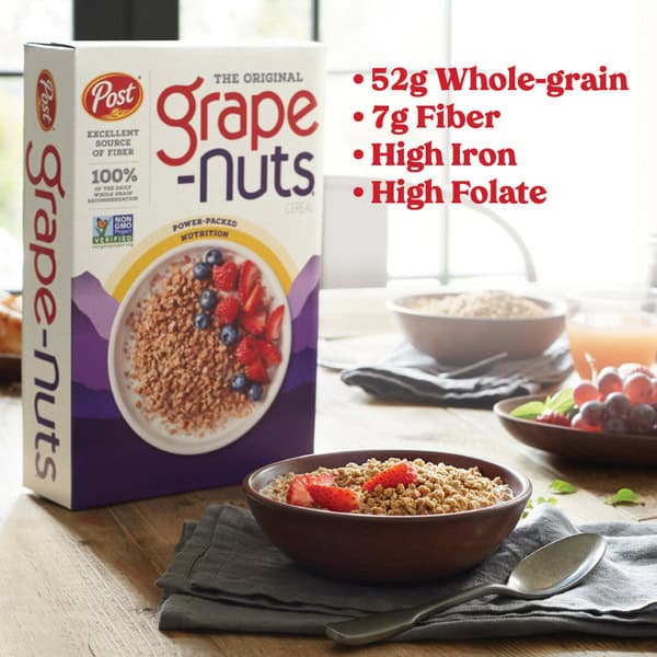 Post Grape-Nuts Original Breakfast Cereal packs plenty of crunch for the modern-day active lifestyle. Grape-Nuts cereal features whole grain wheat and barley baked into sweet and crunchy nuggets of cereal. Grape-Nuts Original Cereal contains 52 grams of whole grain per serving (1) and is an excellent source of fiber and is high in iron and folate. (1) Nutritionists recommend eating 3 or more servings of whole grain foods per day (about 16g whole grain per serving or at least 48g per day).
