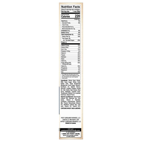 Whole Grain Wheat, Rice, Sugar, Whole Grain Rolled Oats, Dried Blueberries [blueberries, Invert Sugar, Glycerin, Safflower Oil, Citric Acid, Natural Flavor, Potassium Sorbate (preservative)], Degermed Yellow Corn Meal, Brown Sugar, Almonds, Canola Oil, Rice Flour, Salt, Malted Corn And Barley Syrup, Corn Syrup, Whey (from Milk), Caramel Color, Natural Flavor. Bht Added To Packaging Material To Preserve Product Freshness. Vitamins And Minerals: Niacinamide, Reduced Iron, Zinc Oxide (source Of Zinc), Vitamin B6, Vitamin A Palmitate, Riboflavin (vitamin B2), Thiamin Mononitrate (vitamin B1), Folic Acid, Vitamin B12, Vitamin D.