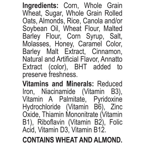 Corn, Whole Grain Wheat, Sugar, Whole Grain Rolled Oats, Almonds, Rice, Canola And/or Soybean Oil, Wheat Flour, Malted Barley Flour, Corn Syrup, Salt, Molasses, Honey, Caramel Color, Barley Malt Extract, Cinnamon, Natural And Artificial Flavor, Annatto Extract (color), Bht Added To Preserve Freshness. Vitamins And Minerals: Reduced Iron, Niacinamide (vitamin B3), Vitamin A Palmitate, Pyridoxine Hydrochloride (vitamin B6), Zinc Oxide, Thiamin Mononitrate (vitamin B1), Riboflavin (vitamin B2), Folic Acid, Vitamin D3, Vitamin B12.