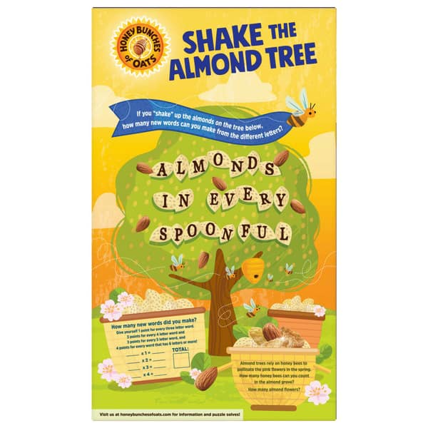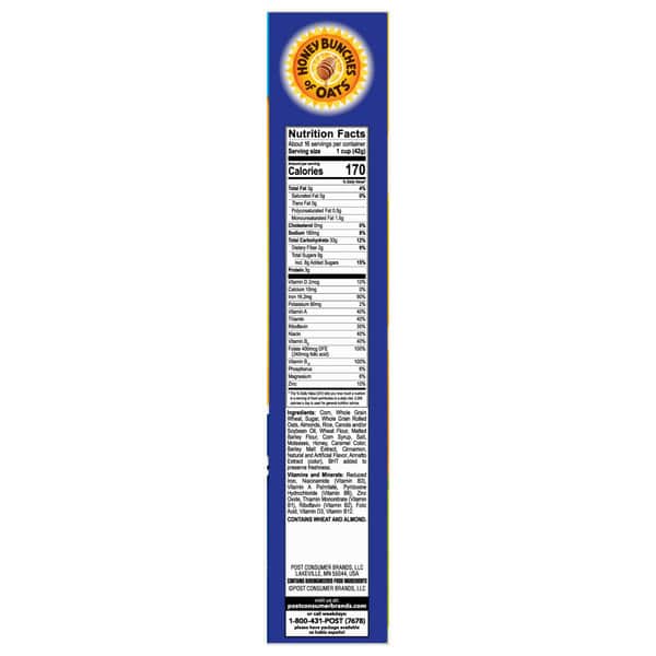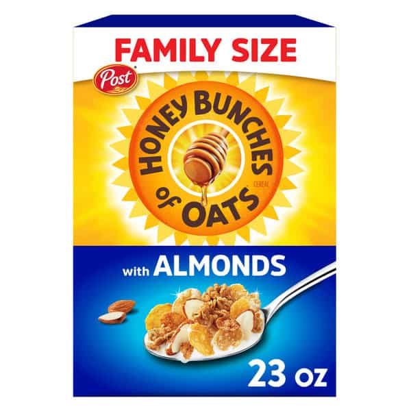 Honey Bunches of Oats with Almonds is packed with 14 grams of whole grains per serving, is a good source of Vitamin D, and Zinc, and is high in vitamins B6 and folate. This heart healthy cereal is the right choice for every pantry.