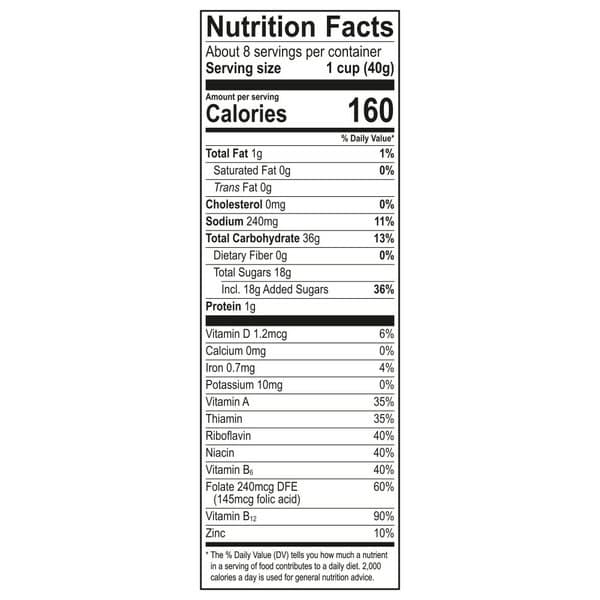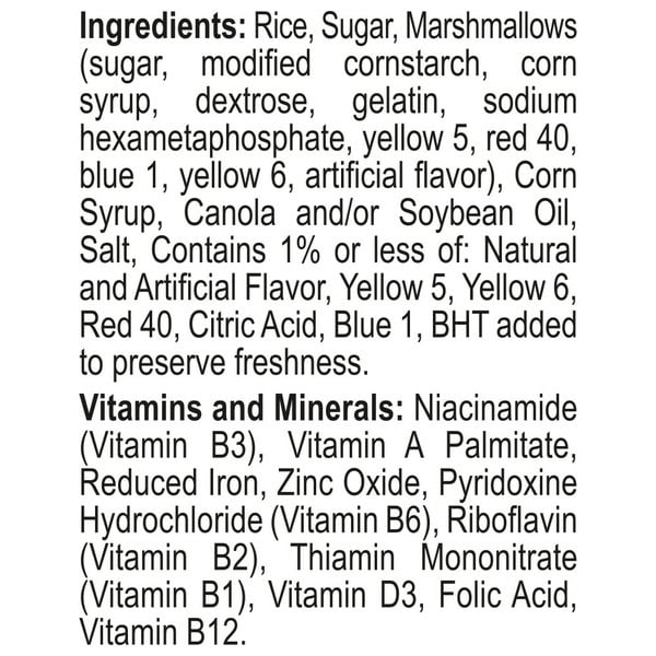 Rice, Sugar, Marshmallows (sugar, Modified Corn Starch, Corn Syrup, Dextrose, Gelatin, Artificial Flavor, Yellows 5 & 6, Blue 1, Red 40), Corn Syrup, Canola And/or Sunflower Oil, Contains 2% Or Less Of: Salt, Natural And Artificial Flavor, Yellow 5, Blue 1, Red 40, Yellow 6. Vitamins And Minerals: Vitamin B1 (thiamin Mononitrate), Vitamin B2 (riboflavin), Niacin (niacinamide), Vitamin B6 (pyridoxine Hydrochloride), Folic Acid, Vitamin B12, Vitamin A Palmitate, Vitamin D, Reduced Iron, Zinc (zinc Oxide).