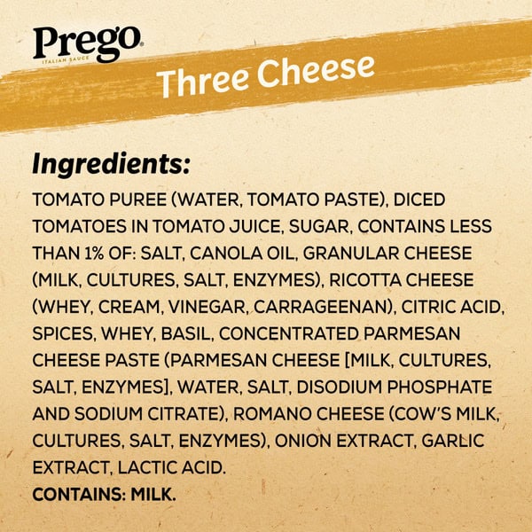 Tomato Puree (water, Tomato Paste), Diced Tomatoes In Tomato Juice Sugar, Contains Less Than 1% Of: Salt, Canola Oil, Granular Cheese (milk, Cultures Salt, Enzymes), Ricotta Cheese (milk, Whey, Distilled Vinegar, Salt), Spices, Citric Acid, Whey, Basil, Concentrated Parmesan Cheese Paste (parmesan Cheese [milk, Cultures Salt, Enzymes], Water, Salt, Disodium Phosphate And Sodium Citrate), Romano Cheese (cow’s Milk, Cultures, Salt, Enzymes), Onion Extract, Garlic Extract, Lactic Acid