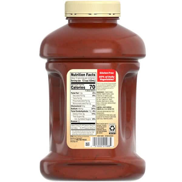Highlighting the delicious taste of vine-ripened tomatoes and perfectly balanced with just the right amount of herbs and seasonings, every jar offers a thick and smooth texture for delicious flavor in every bite. Plus, it’s gluten-free, made without artificial colors, and contains no high fructose corn syrup;it’s a choice you can feel good about every time you serve it.