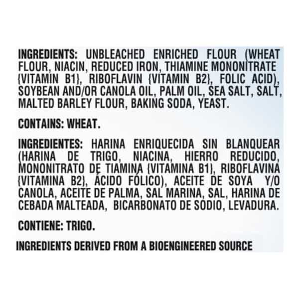Unbleached Enriched Flour (wheat Flour, Niacin, Reduced Iron, Thiamine Mononitrate (vitamin B1), Riboflavin {vitamin B2}, Folic Acid), Soybean And/or Canola Oil, Palm Oil, Sea Salt, Salt, Malted Barley Flour, Baking Soda, Yeast