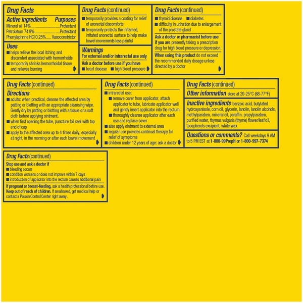 Ask a doctor before use if you have heart disease high blood pressure thyroid disease diabetes difficulty in urination due to enlargement of the prostate gland. Ask a doctor or pharmacist before use if you are presently taking a prescription drug for high blood pressure or depression. For external and/or intrarectal use only . If pregnant or breast-feeding, ask a health professional before use. Keep out of reach of children. If swallowed, get medical help or contact a Poison Control Center right away. intrarectal use: remove cover from applicator, attach applicator to tube, lubricate applicator well and gently insert applicator into the rectum thoroughly cleanse applicator after each use and replace cover also apply ointment to external area regular use provides continual therapy for relief of symptoms children under 12 years of age: ask a doctor. Stop use and ask a doctor if bleeding occurs condition worsens or does not improve within 7 days introduction of applicator into the rectum causes additional pain. When using this product do not exceed the recommended daily dosage unless directed by a doctor.