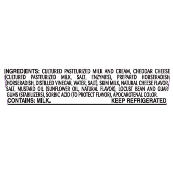 Cultured Pasteurized Milk And Cream, Cheddar Cheese Cultured Pasteurized Milk, Salt, Enzymes), Prepared Horseradish (horseradish, Distilled Vinegar, Water , Salt), Skim Milk, Natural Cheese Flavor, Salt, Mustard Oil (sunflower Oil, Natural Flavor), Locust Bean And Guar Gums (stabilizers), Sorbic Acid (to Protect Flavor), Apocarotenal Color