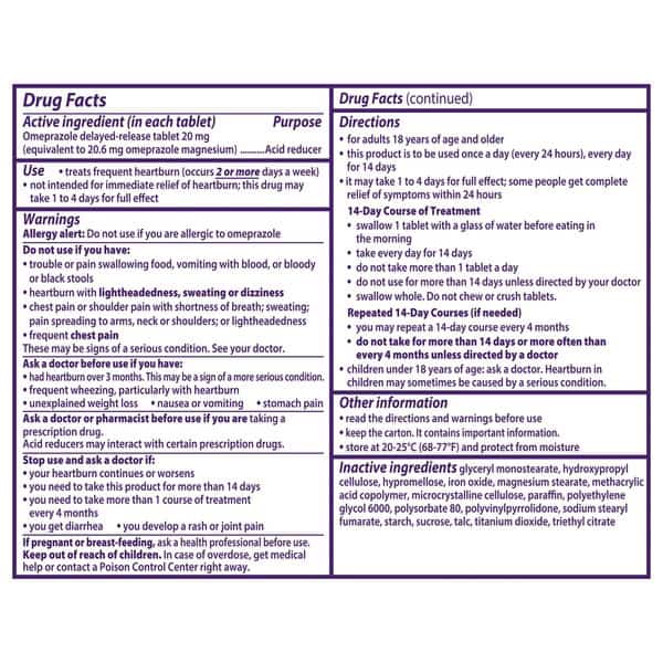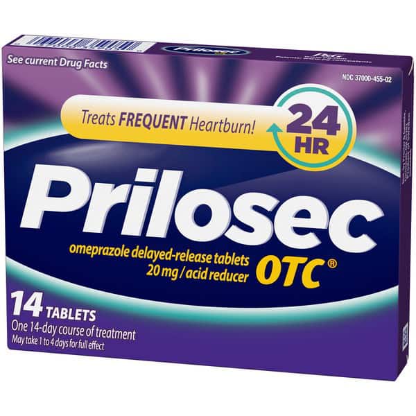With Prilosec OTC, you can take control of heartburn. If you suffer from frequent heartburn, there’s no need to stash antacids everywhere for whenever heartburn might strike. With Prilosec OTC, you can take 1 PILL A DAY for 24 HOURS of ZERO HEARTBURN.* Prilosec OTC is the first and original over-the-counter frequent heartburn (defined as occurring 2 or more times per week) medicine. The active ingredient in Prilosec OTC is omeprazole magnesium delayed-release tablet 20mg (equivalent to 20.6mg omeprazole), which is part of a class of medications called proton pump inhibitors, or PPIs. PPIs reduce stomach acid production by shutting down many of the pumps in the stomach that produce acid. In other words, Prilosec OTC blocks acid production at its source, so you don’t get heartburn in the first place.* Take Prilosec OTC once a day and use as directed for 14 days to treat frequent heartburn. Prilosec OTC may take 1-4 days for full effect. Prilosec OTC is the #1 Doctor†, Gastroenterologist^ and Pharmacist^^ recommended OTC frequent heartburn medicine.