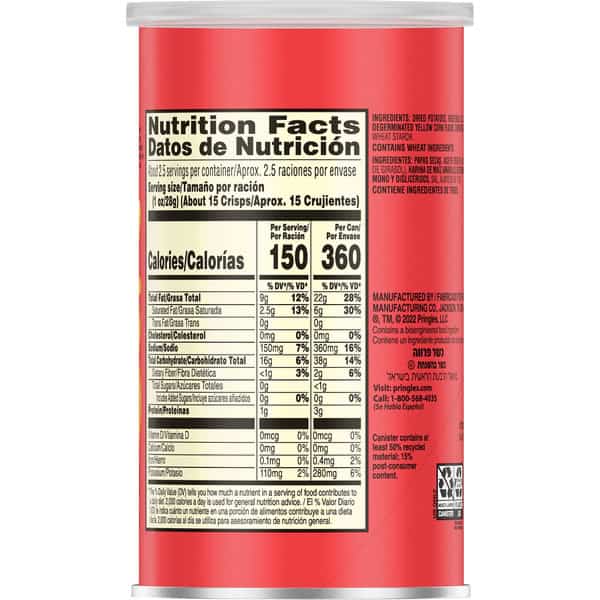 What comes next after the “pop” of a Pringles Original Grab N’ Go can? The crisp, crunchy, hit-the-spot taste of potato seasoned with yummy salt. Ingeniously shaped Pringles Original potato crisps chips are insanely light, crispy, and never greasy. Perfect for sharing, these crisps chips are perfectly salty and bursting with savory flavor. With this convenient, portable can, it’s easy to create your own snacking moments wherever and whenever; Grab a can as a pick-me-up for after school or pack as the ultimate car snack for road trips. Bring these snacks to game time and pack a few for other Pringles fans. Stash this anytime snack in your work desk or pantry to enjoy anytime. Share Pringles at your next cookout or BBQ to turn up the flavor and fun among family and friends. Get your hands on Pringles Original potato crisps chips for an irresistible taste experience that keeps you coming back, stack after stack.