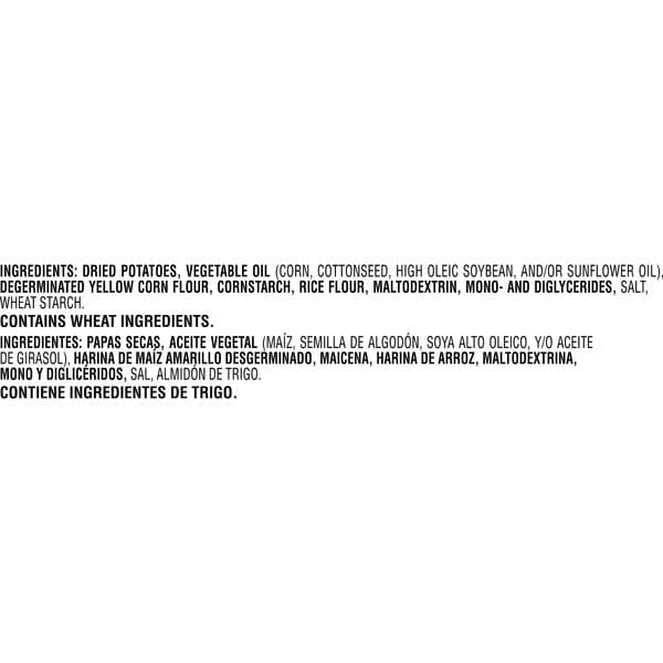 Dried Potatoes, Vegetable Oil (corn, Cottonseed, High Oleic Soybean, And/or Sunflower Oil), Degerminated Yellow Corn Flour, Cornstarch, Rice Flour, Maltodextrin, Mono- And Diglycerides, Salt, Wheat Starch