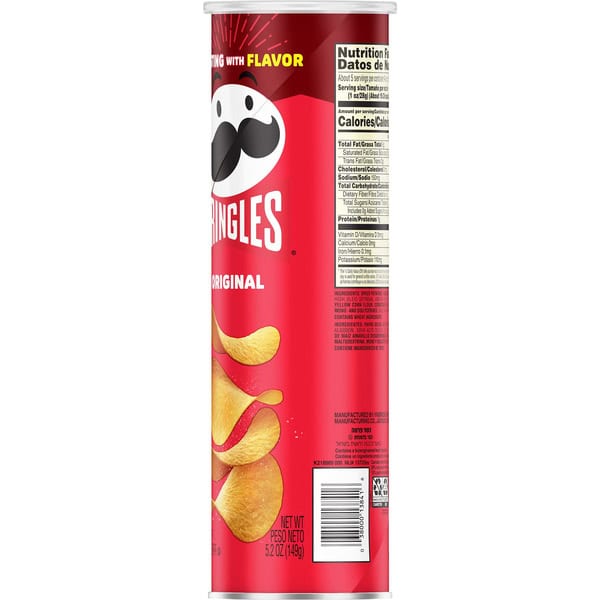 What comes next after the “pop” of a Pringles Original can? The crisp, crunchy, hit-the-spot taste of potato seasoned with salty goodness. Ingeniously shaped Pringles Original potato crisps are insanely light, crispy, and never greasy. Perfect for sharing, these crisps chips are perfectly salty and bursting with savory flavor. With this convenient, portable can, it’s easy to create your own snacking moments wherever and whenever; Grab a can as a pick-me-up for after school or pack as the ultimate car snack for road trips. Bring these snacks to game time and pack a few for other Pringles fans. Stash this snack in your work desk or pantry to enjoy anytime. Share Pringles at your next cookout or BBQ to turn up the flavor and fun among family and friends. Get your hands on Pringles Original potato crisps for an irresistible taste experience that keeps you coming back, stack after stack.