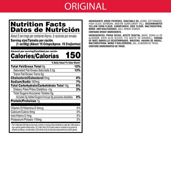 Dried Potatoes, Vegetable Oil (corn, Cottonseed, High Oleic Soybean, And/or Sunflower Oil), Degerminated Yellow Corn Flour, Cornstarch, Rice Flour, Maltodextrin, Mono- And Diglycerides, Salt, Wheat Starch