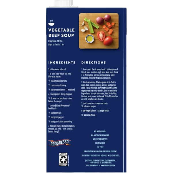 Stock your pantry with this staple ingredient to help make delicious, home-cooked meals right at your fingertips. Progresso Classic Beef Broth is gluten free and fat free with no preservatives. Enjoy the cozy, delicious flavors of beef broth in your next homemade soup, stew, roast, casserole or slow cooker recipe. When you’re looking for an enhanced taste in your next meal, try our gluten-free beef broth and discover your new favorite pantry ingredient that is made with no artificial flavors or added MSG.*