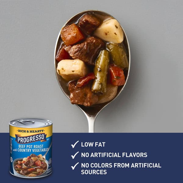 Progresso Beef Pot Roast with Country Vegetables canned soup is loaded with tasty ingredients like tender chunks of homestyle pot roast, savory vegetables, and beef broth. It’s a soup that tastes more like a stew. Unlike instant ramen, Progresso soup is ready to serve, no need to add water. Enjoy a warm bowl or cup that’s ready in minutes with a toasted sandwich or fresh bread. Looking for convenience on a weeknight? Try our Easy Beef Stew in Biscuit Cups recipe, using our tasty soup and Pillsbury Grands! Southern Homestyle Buttermilk Biscuits. Progresso beef pot roast soup contains no artificial flavors and is gluten free. You’ll love the hearty, savory satisfaction of a classic Progresso canned soup. Heat it up on the stove or in the microwave using a microwave-safe bowl for hot soup in under 5 minutes. Let soup sit for 1 minute before removing from the microwave. Handle with care, stir, eat, and enjoy. At Progresso, we’re passionate about making great products. We’ve been creating premium soups for more than 100 years. And today, Progresso still uses quality ingredients for a tasteful flavor found only in our line of canned soup products.