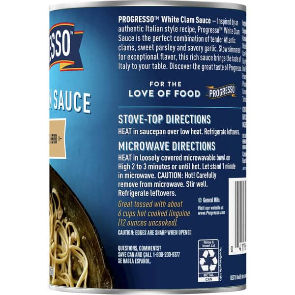 When you’re looking for the perfect seafood sauce for your next recipe, try Progresso White Clam Sauce With Garlic & Herb. It’s inspired by an authentic Italian-style recipe and includes the perfect combination of tender clams, sweet parsley and savory garlic sauce. Keep on hand as a pantry staple. Your creativity is the limit with this decadent, delicious clam sauce. This rich, savory sauce can bring the taste of Italy to your table. Use it as a white sauce with cooked linguini or use in a recipe to add amazing seafood flavor.