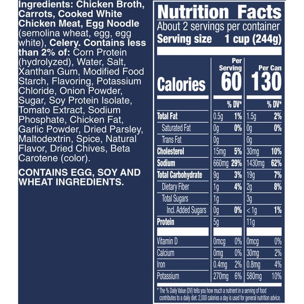 Chicken Broth, Carrots, Cooked White Chicken Meat, Egg Noodle (semolina Wheat, Egg, Egg White), Celery, Contains Less Than 2% Of: Corn Protein (hydrolyzed), Water, Salt, Xanthan Gum, Modified Food Starch, Flavoring, Potassium Chloride, Onion Powder, Sugar, Soy Protein Isolate, Tomato Extract, Sodium Phosphate, Chicken Fat, Garlic Powder, Dried Parsley, Maltodextrin, Spice, Dried Chives, Natural Flavor, Beta Carotene (color)