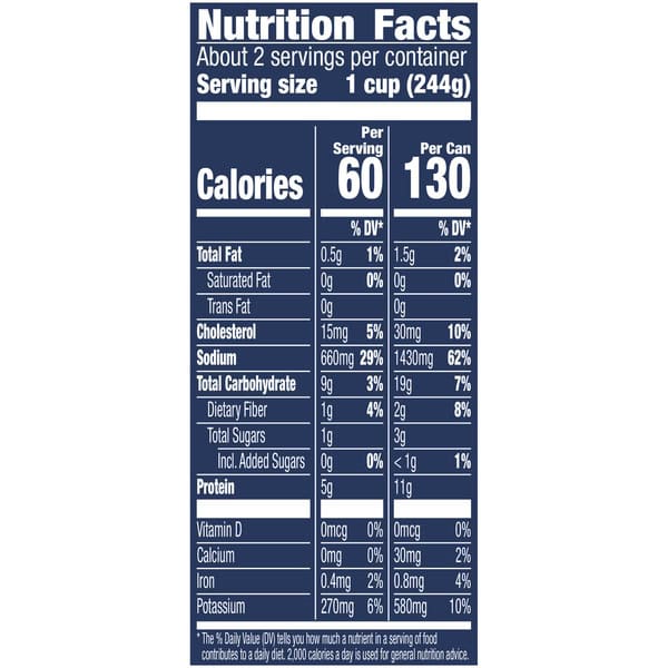 • QUALITY INGREDIENTS: No artificial flavors and no colors from artificial sources; Half cup of vegetables in every can and low fat per serving