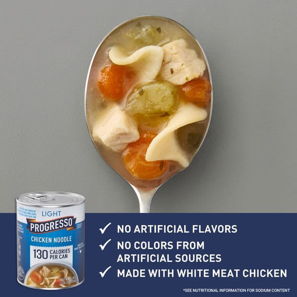 Like our original recipe, Progresso Light Chicken Noodle Soup features chicken broth, carrots, tender chunk white meat chicken, and egg noodle. Our light recipe alternative is 130 calories per can – at least 33% fewer calories per serving than the leading chicken, pasta, and vegetable ready-to-serve soup.* This Progresso Soup contains no artificial flavors and no colors from artificial sources – just the delicious taste you’ve come to expect from Progresso. There is a half cup of vegetables in every can, and low fat per serving (see nutrition information for sodium content). Unlike instant ramen, Progresso soup is ready to serve, no need to add water. Serve it in minutes by following the easy warming direction on the can. Try a bowl alongside a toasted sandwich or fresh bread as part of lunch or dinner. About two servings per can. At Progresso, we’re passionate about making great products. We’ve been creating soups ranging from Chicken Noodle to Tomato Basil and beyond for more than 100 years. And today, Progresso still uses quality ingredients for enticing flavor found in our line of canned soup products. Contains shelf-stable Progresso Light Chicken Noodle Soup, Ready to Serve Canned Soup, 18.5 oz. *Progresso Light: 60 calories, 0.5g fat per serving; Leading chicken, pasta, and vegetable ready-to-serve soup: 100 calories, 2.5g fat.
