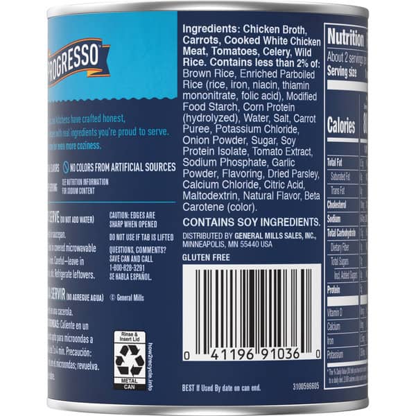Chicken Broth, Carrots, Cooked White Chicken Meat, Tomatoes, Wild Rice, Celery, Brown Rice, Contains Less Than 2% Of: Modified Food Starch, Corn Protein (hydrolyzed), Water, Salt, Carrot Puree, Potassium Chloride, Onion Powder, Sugar, Soy Protein Isolate, Tomato Extract, Sodium Phosphate, Garlic Powder, Dried Parsley, Calcium Chloride, Citric Acid, Maltodextrin, Natural Flavor, Beta Carotene (color), Flavoring
