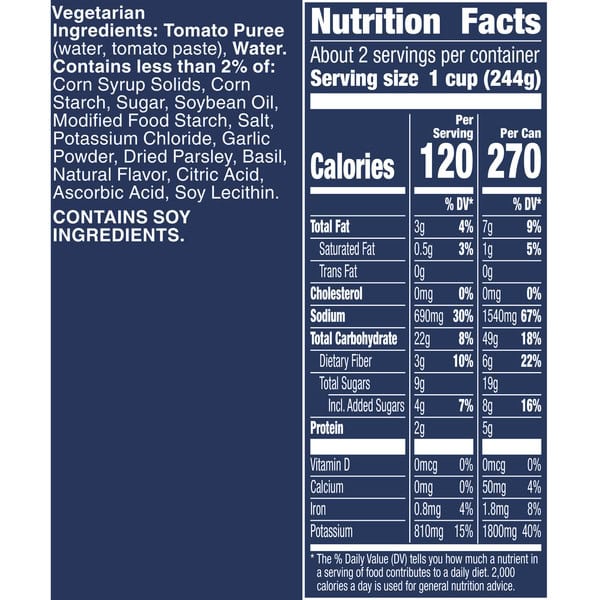 Tomato Puree (water, Tomato Paste), Water, Contains Less Than 2% Of: Corn Syrup Solids, Corn Starch, Sugar, Soybean Oil, Modified Food Starch, Salt, Potassium Chloride, Garlic Powder, Dried Parsley, Basil, Natural Flavor, Citric Acid, Ascorbic Acid, Soy Lecithin