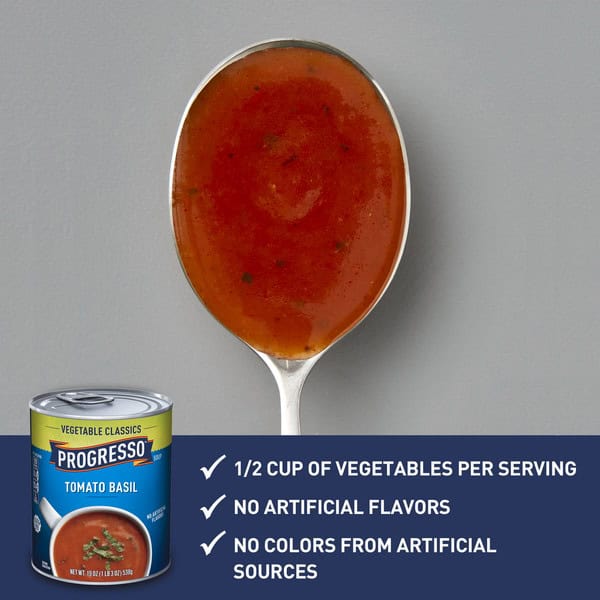 • VEGETABLE CLASSICS: Progresso Tomato Basil Soup made with one-half cup vegetables per serving; A delicious food that makes a tasty part of lunch or dinner