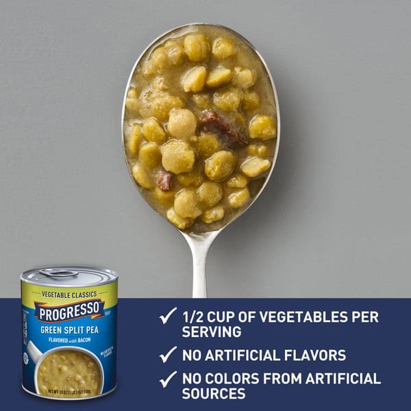 Progresso Vegetable Classics Green Split Pea Soup flavored with bacon is a comfort food favorite. This gluten free canned soup contains a half cup of vegetables per serving (see nutrition information for sodium content), and is made without artificial flavors. Unlike instant ramen, Progresso Soup is ready to serve, no need to add water. Have a bowl of this Progresso pea soup as a flavorful addition to any lunch or dinner. Our microwavable soup is ready to eat in minutes by following the easy warming directions on the can. About two servings per can. At Progresso, we’re passionate about making great products. We’ve been creating soups ranging from Chicken Noodle to Tomato Basil and beyond for more than 100 years. And today, Progresso still uses quality ingredients for enticing flavor found in our line of canned soup products. Contains shelf-stable Progresso Green Split Pea Soup, Vegetable Classics Canned Soup, Gluten Free, 19 oz.