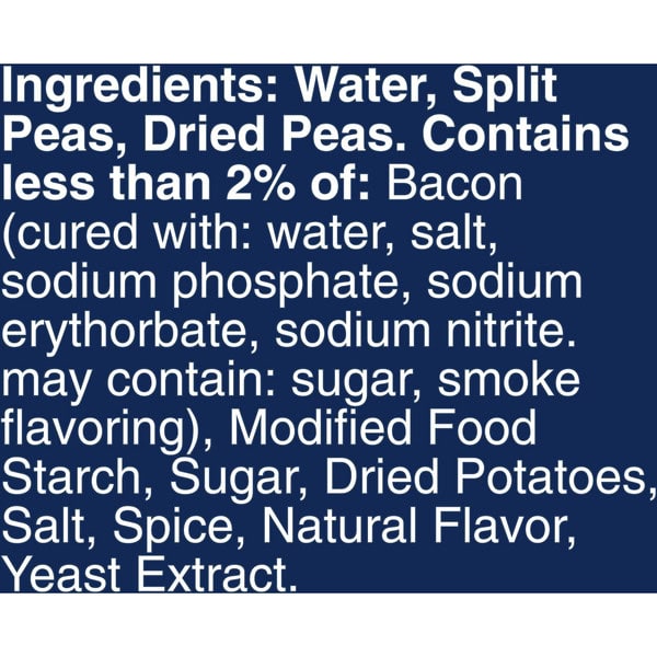 Water, Split Peas, Dried Peas, Contains Less Than 2% Of: Bacon (cured With: Water, Salt, Sodium Phosphate, Sodium Erythorbate, Sodium Nitrite. May Contain: Sugar, Smoke Flavoring), Modified Food Starch, Sugar, Dried Potatoes, Salt, Spice, Natural Flavor, Yeast Extract