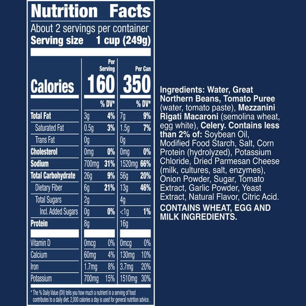 Water, Great Northern Beans, Tomato Puree (water, Tomato Paste), Mezzanini Rigati Macaroni (semolina Wheat, Egg White), Celery, Contains Less Than 2% Of: Soybean Oil, Modified Food Starch, Salt, Corn Protein (hydrolyzed), Potassium Chloride, Dried Parmesan Cheese (milk, Cultures, Salt, Enzymes), Onion Powder, Sugar, Tomato Extract, Garlic Powder, Yeast Extract, Natural Flavor, Citric Acid