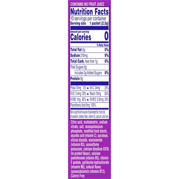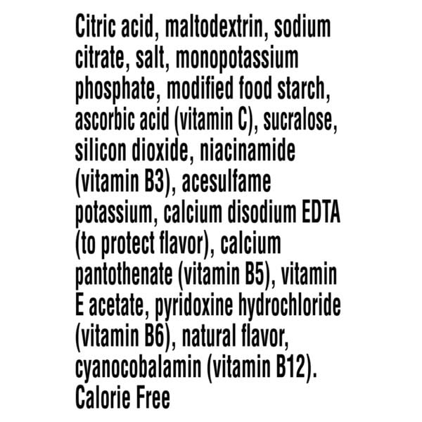 Citric Acid, Maltodextrin, Sodium Citrate, Salt, Monopotassium Phosphate, Modified Food Starch, Sucralose, Ascorbic Acid (vitamin C), Silicon Dioxide, Vitamin E Acetate, Niacinamide (vitamin B3), Acesulfame Potassium, Calcium Pantothenate (vitamin B5), Calcium Disodium Edta (to Protect Flavor), Pyridoxine Hydrochloride (vitamin B6), Natural Flavor, Cyanocobalamin (vitamin B12)
