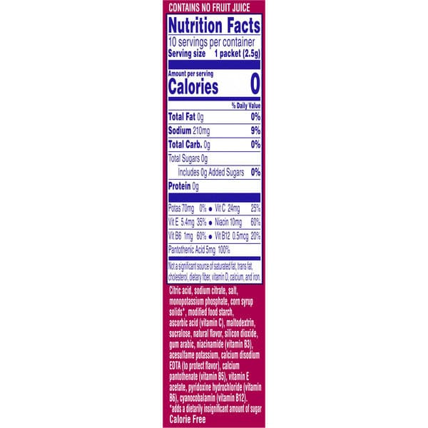 Citric Acid, Sodium Citrate, Salt, Monopotassium Phosphate, Corn Syrup Solids*, Modified Food Starch, Maltodextrin, Sucralose, Ascorbic Acid (vitamin C), Natural Flavor, Silicon Dioxide, Gum Arabic, Vitamin E Acetate, Niacinamide (vitamin B3), Acesulfame Potassium, Calcium Pantothenate (vitamin B5), Calcium Disodium Edta (to Protect Flavor), Pyridoxine Hydrochloride (vitamin B6), Cyanocobalamin (
