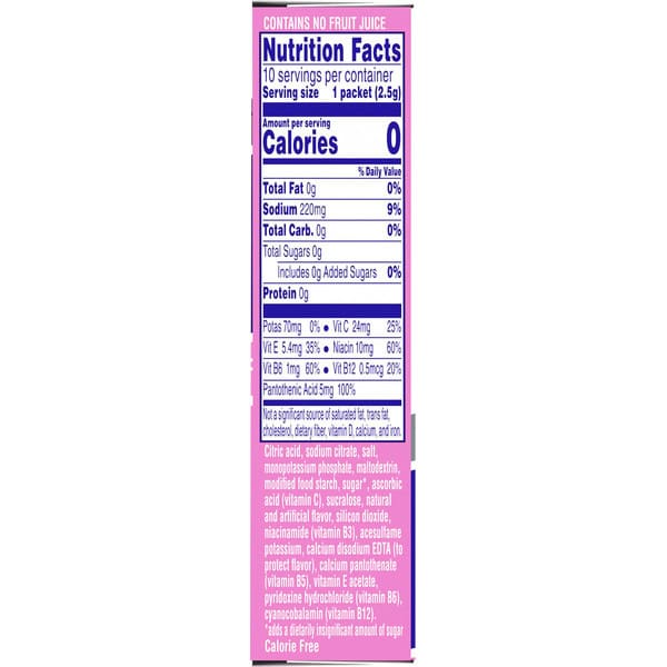 Citric Acid, Sodium Citrate, Salt, Monopotassium Phosphate, Maltodextrin, Modified Food Starch, Sugar*, Sucralose, Ascorbic Acid (vitamin C), Natural And Artificial Flavor, Silicon Dioxide, Vitamin E Acetate, Niacinamide (vitamin B3), Acesulfame Potassium, Calcium Pantothenate (vitamin B5), Calcium Disodium Edta (to Protect Flavor), Pyridoxine Hydrochloride (vitamin B6), Cyanocobalamin (vitamin B