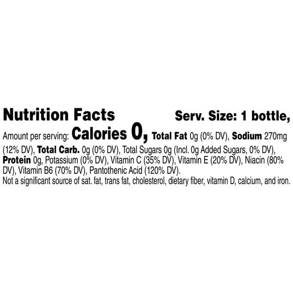 Water, Citric Acid, Sodium Hexametaphosphate (to Protect Flavor), Natural Flavor, Salt, Potassium Sorbate (preserves Freshness), Potassium Citrate, Sodium Citrate, Ascorbic Acid (vitamin C), Sucralose, Acesulfame Potassium, Calcium Disodium Edta (to Protect Flavor), Calcium Pantothenate (vitamin B5), Niacinamide (vitamin B3), Vitamin E Acetate, Pyridoxine Hydrochloride (vitamin B6).