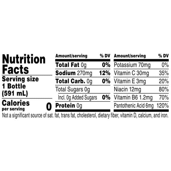 Water, Citric Acid, Sodium Hexametaphosphate (to Protect Flavor), Natural Flavor, Salt, Potassium Sorbate (preserves Freshness), Potassium Citrate, Sodium Citrate, Ascorbic Acid (vitamin C), Sucralose, Acesulfame Potassium, Calcium Disodium Edta (to Protect Flavor), Calcium Pantothenate (vitamin B5), Niacinamide (vitamin B3), Vitamin E Acetate, Pyridoxine Hydrochloride (vitamin B6)