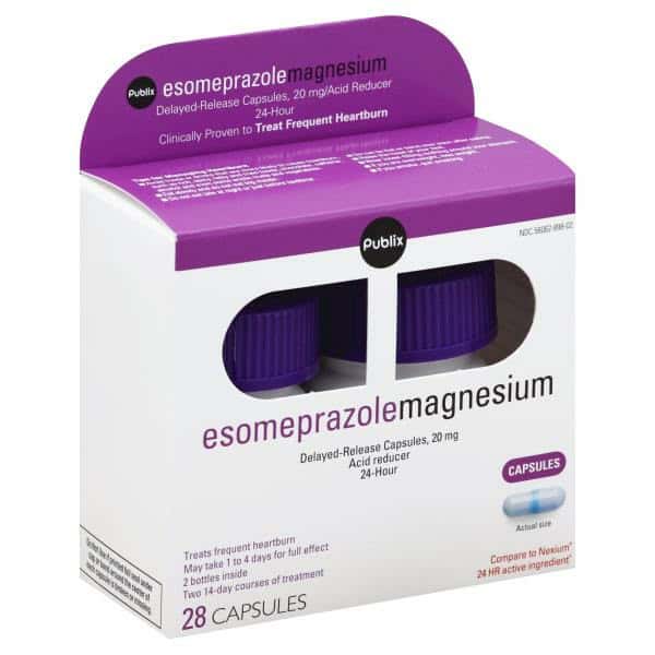 Ask a doctor before use if you have had heartburn over 3 months. This may be a sign of a more serious condition. frequent wheezing, particularly with heartburn unexplained weight lass nausea or vomiting stomach pain. Stop use and ask a doctor if your heartburn continues or worsens you need to take this product for more than 14 days you need to take more than 1 course of treatment every 4 months you get diarrhea you develop a rash or joint pain. Do not use if you have: trouble or pain swallowing food, vomiting with blood, or bloody or black stools heartburn with lightheadedness, sweating or dizziness chest pain or shoulder pain with shortness of breath; sweating; pain spreading to arms, neck or shoulders; or lightheadedness frequent chest pain. These may be signs of a serious condition. See your doctor. If pregnant or breast-feeding, ask a health professional before use. Keep out of reach of children. In case of overdose, get medical help or contact a Poison Control Center right away. (1-800-222-1222). Warnings Allergy alert: Do not use if you are allergic to esomeprazole. Ask a doctor or pharmacist before use if you are taking a prescription drug. Acid reducers may interact with certain prescription drugs.