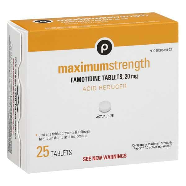 In Each Tablet Other Information: Read the directions and warnings before use. Keep the carton. It contains important information. Store at 68 degrees – 77 degrees F (20 degrees – 25 degrees C). Protect from moisture. Famotidine tablets, 20 mg. Just one tablet prevents & relieves heartburn due to acid indigestion. Compare to maximum strength Pepcid AC active ingredient (This product is not manufactured or distributed by Johnson & Johnson Consumer Inc., distributor of Maximum Strength Pepcid AC). publix.com.