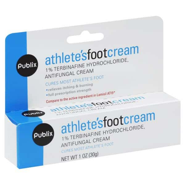 Other Information: Do not use if seal on tube is broken or is not visible. Store at controlled room temperature 68-77 degrees F (20-25 degrees C). See carton or tube crimp for lot number and expiration date. Misc: 1% terbinafine hydrochloride, antifungal cream. Cures most athlete’s foot. Relieves itching & burning. Full prescription strength. Compare to the active ingredient in Lamisil AT (This product is not manufactured or distributed by Novartis Consumer Health, Inc., owner of the registered trademark Lamisil AT). publix.com. Publix Guarantee: Complete satisfaction. Made in Canada.