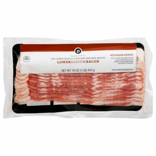 Sodium has been reduced from 175 mg to 105 mg per serving. Lower sodium. 35% lower sodium than our original bacon. No sugar added. Not a low calorie food. See nutrition facts panel for sugar and calorie content. Sodium has been reduced from 175 mg to 105 mg per serving. Publix Guarantee: Complete satisfaction or your money back. U.S. inspected and passed by Department of Agriculture. publix.com. Scan for more information.