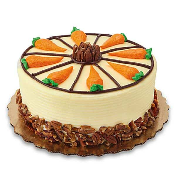 Four moist layers of delectable carrot cake separated by luscious cream cheese icing. The same irresistible icing covers the entire torte, which is elegantly garnished with chocolate piping, buttercream carrots, and pecans. Serving ware shown not included.