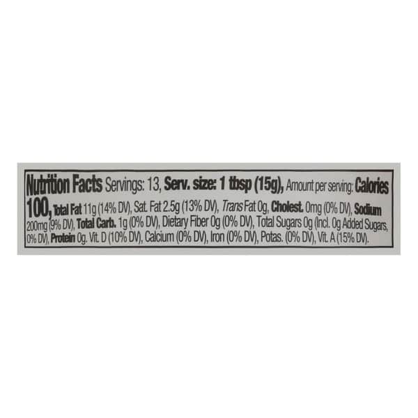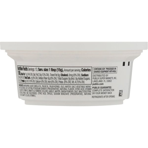 Margarine (Liquid Canola Oil, Palm Oil, Palm Kernel Oils, Water, Salt, Vegetable Mono- and Diglycerides, Soy Lecithin, Potassium Sorbate [Preservative], Natural Flavor, Citric Acid, Vitamin A Palmitate, Vitamin D2, Annatto & Turmeric [Color]), Garlic, Water, Onion Powder, Salt, Maltodextrin, Vegetable Mono- and Diglycerides, Citric Acid, Spices, Sodium Benzoate (Preservative), Natural Flavor, Annatto (Color), Vitamin E.